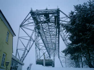 bald hundert Jahren überragt die Schwebefähre von Osten, in ihrer