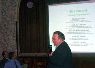 In seinem Grußwort hob Osteland-Vorsitzender Gerald Tielebörger die Bedeutung der AG Osteland als Brücke zwischen Ober- und Unterlauf und zwischen Einheimischen und Zugereisten hervor. Zu den Motiven der ehrenamtlichen Akteure sagte er: "Vielleicht haben wir uns uns in dieses ökonomisch unterentwickelte, menschlich aber so überaus gut entwickelte Osteland verliebt."
