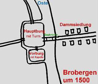 "Bis zum Dreißigjährigen Krieg überquerte eine Zugbrücke die Oste, danach die Fähre. Eine Burg wurde erstmals Mitte des 13. Jahrhunderts erwähnt, Zerfall und Neuaufbau im 16. Jahrhundert. Dammsiedlung auf der Ostseite seit Mitte des 13. Jahrhunderts (wie die Burg, durch Funde belegt). Die heute noch deutlich sichtbare - südliche - Wurt trug mit ziemlicher Sicherheit die im Dreißigjährigen Krieg durch Brand zerstörte Burgkapelle. Neueste Funde scheinen das zu belegen."