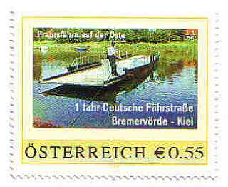 23. 5. 2005. Zum ersten Jahrestag der Eröffnung der Deutschen Fährstraße Bremervörde � Kiel am 26. Mai 2005 hat die Österreichische Post AG eine 55-Cent-Sondermarke herausgegeben, die eine der letzten handbetriebenen Prahmfähren im Osteland zeigt.