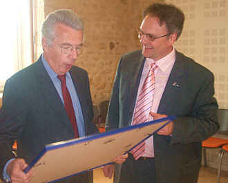 Bürgermeister Hubert übergab ein kunstvoll gerahmtes Poster mit Schwebefähren-Fotos des Ostener Künstlers Nikolaus Ruhl. Das Bild werde, wie Huberts Amtskollege Grasset versicherte, einen Ehrenplatz im Rathaus der einzigen französischen Schwebefährenstadt finden.