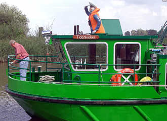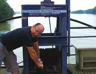 3. 8. 2006. Jahrelang beförderte Gastwirt und Fährmann Helmut Plate, Träger des Osteland-Kulturpreises 2005, mit der muskelbetriebenen Gräpeler Ostefähre vor allem Radler und Wanderer. Jetzt muß er Autos übersetzen - die Bremervörder Ostebrücke ist wegen Reparaturarbeiten für zwei Wochen gesperrt.