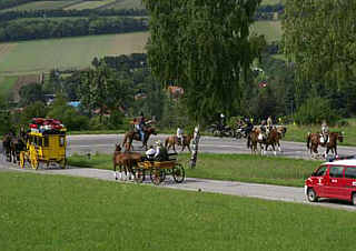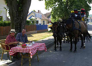 1. 8. 2006. Frühstück auf der Landstraße, in Sichtweite der Pferde - die Osteland-Kutsche rollt bei ihrem Weltrekordversuch zur Zeit durch Ungarn, Kurs Plattensee (Balaton). Dreieinhalb Monate sind vergangen, seit die "Botschafter des Ostelandes" in Hechthausen gestartet sind. Nach der Fahrt durch die Puszta sind dies die Stationen der kommenden Wochen: Budapest, Spanische Hofreitschule Wien, Karlsbrücke Prag, Dresden, Spreewald, Schloss Sanssouci, Gestüt Redefin, Hamburger Fischmarkt und die alte Hansestadt Stade.