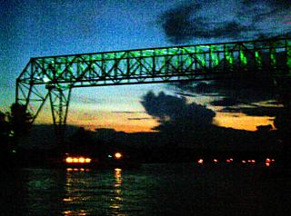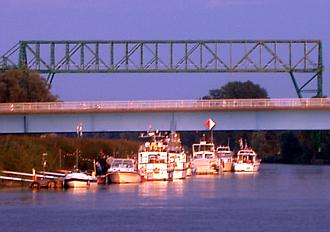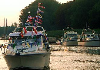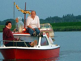 27. 8. 2006. Bestes Wetter, rund zwanzig festlich beflaggte und beleuchtete Boote und Schiffe erstmals unter der illuminierten Schwebefähre - so eine Lampionfahrt auf der Oste wie am Sonnabend hat es vorher nie gegeben.