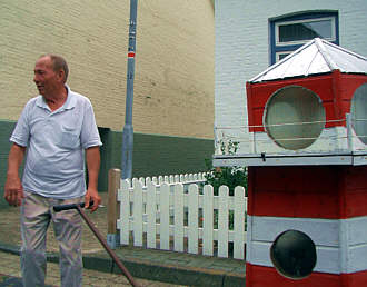 1. 8. 2006. Nanu? Ein Leuchtturm rollte am Montag durch Oberndorf - auf einem Handwagen, gezogen von Hans Bünning, genannt "Löpel-Hannes", dem alten Seebären und Gastronomen aus Leidenschaft.