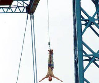 28. 8. 2006. Ein Förderverein für den britischen Fußball-Erstligisten Middlesbrough AFC - kurz "Boro" genannt - hat ein öffentliches Bungee-Springen von der örtlichen Schwebefähre veranstaltet.