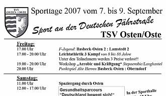 4. 9. 2007. Unter dem Motto "Sport an der Deutschen Fährstraße" beginnen am Freitag, 7. September, die Sporttage beim TSV Osten. Auf ein Fußballspiel der F-Jugend-Mannschaften vom FC Basbeck-Osten gegen Lamstedt 2 folgt der Leichtathletik-Dreikampf für Teilnehmer von von 8 bis 88 Jahren.