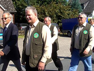 Eine fünfköpfige Abordnung des Ostener Schützenvereins, angeführt von Präsident Wilfried Röndigs (l.) und Hauptmann Thorben Gruschka (r.), genoß die sprichwörtliche Osterrönfelder Herzlichkeit und Gastfreundschaft - neuer Beweis dafür, dass die 2006 besiegelte Partnerschaft der beiden Schwebeffährdörfer in bester "Atmosfähre" gedeiht - nicht zuletzt auch dank Bürgermeister Bernd Sienknecht (2. v. r.) und Schützenchef Hans-Peter Wachholz (2. v. l.).