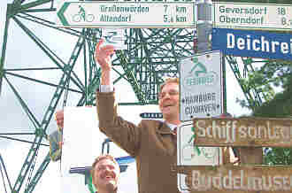26. 5. 2004. Nach nur neunmonatiger Planung wurde die Deutsche Fährstraße von Gerald Tielebörger, dem 1. Vorsitzenden der AG Osteland, und Monika Heise, Geschäftsführerin der Tourist-Info Nord-Ostsee-Kanal, eröffnet - "ein Festtag für das Osteland", so Initiator Jochen Bölsche. Sein Festvortrag "Von der Idee zur Wirklichkeit" - über die "Geschichte einer wahren Liebe" - steht hier.