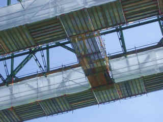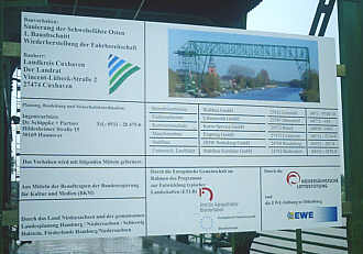 1. 9. 2004. Die Restaurierungsarbeiten an der Ostener Schwebefähre, einem der Wahrzeichen der Deutschen Fährstraße, sind nun in vollem Gange. Mittlerweile steht auch das Bauschild. Unser Bild vergrößern: hier. Mehr zur Reparatur unter www.schwebefaehre.org.