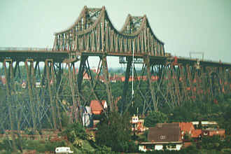 Mit einer historisch-literarischen Revue zum Denkmalschutztag gedachte die Gemeinde der 100. Wiederkehr des 1. September 1904, an dem der Rat des damaligen 600-Seelen-Dorfes den mutigen Beschluss gefasst hatte, eine europaweit einzigartige Fährbrücke zu bauen: Unter einem 38 Meter hohen Stahlgittergerüst verkehrt eine starr aufgehängte elektrisch betriebene Gondel, die den Fluss queren kann, ohne den Schiffsverkehr zu behindern.