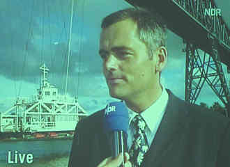 1. 9. 2004. Gleich in zwei Live-Sendungen berichtete das NDR-Fernsehen in seiner Reihe "DAS unterwegs" am 30. August über die beiden Schwebefähren in seinem Sendegebiet. Während sich um 14 Uhr im Hintergrund das Traumschiff MS "Europa" der Rendsburger Hochbrücke näherte, interviewte die Moderatorin oben auf dem Steuerstand der Schwebefähre den Ostener Journalisten Jochen Bölsche vom Weltverband der Schwebefähren über das Engagement des spanischen Königs Juan Carlos I. für die Erhaltung der beiden Baudenkmale in Osten/Hemmoor und Rendsburg/Osterrönfeld.