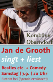 ![]() Dank der Initiative von Jan de Grooth und Kersten Wellm findet zum fünften Mal in der KOMBÜSE eine Jam Session statt. Musiker_innen und Musikbegeisterte der ganzen Welt sind herzlich eingeladen zum gemeinsamen spielen, singen oder hören. Es wird laut und fröhlich bis ca. 22 Uhr. ![]() In der Reihe »Lieblingsbuch« liest Katinka Ritter aus der Bestseller-Novelle von Alan Bennett: »Die souveräne Leserin«. Also hätten wir schon mal zwei an diesem Abend! Die fiktive Geschichte beschreibt die Entwicklung der englischen Queen von der hoch disziplinierten Regentin zur schöngeistigen Literatin. ![]() Das Duo »musica e parole« aus Berlin kommt nach Oberndorf! Katharina Richter und Rudolf Gäbler singen, flüstern, spielen, sprechen ein musikalisch-literarisches Programm über die Straftat: mit klassisch-kriminellen Zugstücken von Heinrich Heine und Alexander Puschkin bis Friedrich Hollaender, Bert Brecht und Frank Wedekind … ![]() Jürgen Gebert ist Schauspieler und Regisseur am Kellertheater Hamburg, Leiter div. Schauspielworkshops für das Kellertheater wie für den Landesverband der Hamburger Amateurtheater und Veranstalter von literarischen Lesungen – an diesem Tag zum ersten Mal bei uns. Tucholsky in allen Facetten! Für Februar ist u. a. eine Krimilesung mit der Osteland-Fachgruppe Krimiland vorgesehen. Mehr unter kombuese53grad.de.