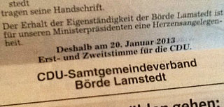 Stattdessen haben die Lamstedter Samtgemeindepolitiker immer politisch agiert: Während in der Nachbarschaft durch die Kreishauskultur geformte Karrierebeamte teils noch immer versuchen, den Druck von oben unvermindert an die Bürger (und deren Kinder) weiterzugeben, haben die Bördeaner auf Schlitzohrigkeit gesetzt - und auf ihren schwarzen Draht nach Hannover. Die Folge: Die CDU-Hochburg Samtgemeinde Börde Lamstedt - mit bis zu 96,55 Prozent (Nordahn) Stimmenanteil für McAllister - sah sich immer bevorzugt behandelt. Während Gemeinden in anderen Regionen von der CDU-gesteuerten Landesverwaltung mit Knebelverträgen oder sanftem Druck zur Aufgabe ihrer Bürgernähe und ihrer Selbstständigkeit genötigt wurden (beliebte Drohung: Wer sich nicht bewegt, wird bewegt), durften die Christdemokraten in McAllisters "schwarzer Perle" noch am Tag vor der Wahl annoncieren, die "Eigenständigkeit der Börde Lamstedt" (gerade 6000 Einwohner) sei diesem Ministerpräsidentem eine "Herzensangelegenheit". Mit der Abwahl McAllister ist dieser Draht nach Hannover erst mal abgerissen. Die Samtgemeinde will den Status quo nun rasch zementieren, durch die Neuwahl (auf acht Jahre!) eines Otten-Nachfolgers, und am 27. Februar ein rauschendes Fest zu ihrem 50-jähriges Bestehen feiern, in Anwesenheit McAllisters, der in der Börde einen höheren Stimmenanteil einfahren konnte als in seiner eigenen Heimatgemeinde Bad Bederkesa. CDU Hemmoor meldet Zweifel an...