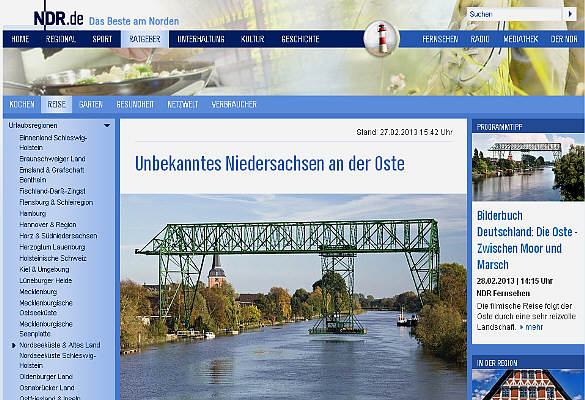 der NDR-Website 28. 2. 2013. Ein werbewirksames Porträt des Ostelandes ist jetzt auf der Website des NDR aufrufbar. Darin heisst es: "Es ist eine stille Region, wenig bekannt, ruhiges Bauernland zwischen Weser und Elbe. Durch diese flache Landschaft schlängelt sich die Oste, mit gut 150 Kilometern der längste Nebenfluss der Elbe in Niedersachsen. Zwischen der Quelle südlich von Tostedt am Rand der Lüneburger Heide und der Mündung südöstlich von Cuxhaven liegen nur 55 Meter Höhenunterschied. Entsprechend gemächlich beginnt das Flüsschen seine Reise, sammelt bis Sittensen das Wasser von vielen Nebenflüssen aus den umliegenden Moorgebieten. Zwischen Wiesen und Feldern entwickelt sich die Obere Oste so zu einem interessanten Revier für Kanuten und Paddler...." Weiterlesen...