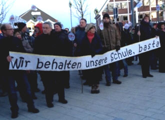 Bürgermeister Horeis bei der Demo - VIDEO Doch wenig später beschloss der Samtgemeinderat die Schließung der mehrfach ausgezeichneten Kiebitzschule zum Schuljahr 2014/15 - bei nur acht Gegenstimmen.