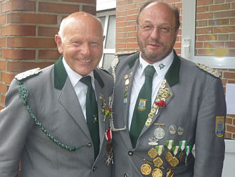 7. 8. 2011. Die vor mehr als fünf Jahren offiziell besiegelte Partnerschaft der beiden Schwebefähren-Orte Osten und Osterrönfeld lebt. Das zeigte sich erneut beim Ostener Schützenfest, bei dem Schützenpräsident Wilfried Röndigs (auf unserem Foto mit Vorgänger Herbert Guthahn) und Bürgermeister Carsten Hubert eine 25-köpfige Abordnung vom Nord-Ostsee-Kanal begrüßen konnten, darunter auch den Osterrönfelder Bürgermeister Bernd Sienknecht.