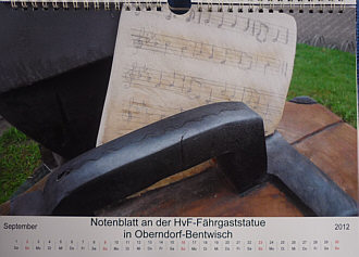 Ein drittes Foto zeigt ein Detail der Statue: Hoffmanns Koffer, aus dem ein Notenblatt mit dem "Lied der Deutsachen" herausragt.