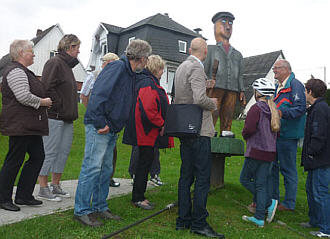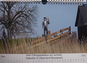 im Frühjahr errichtete Fährmann-Statue auf dem Deich, die den