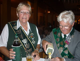 Bevor das Kommando "Gulasch marsch" ertönte, hatte Ehrenlandrat Martin Döscher das Publikum mit einer seiner launigen Ansprachen amüsiert, der Osterrönfelder Vize-Bürgermeister und Schützenkönig Uwe Tödt (l.) die harmonische Vereins- und Gemeindepartnerschaft im Zeichen der Schwebefähren gewürdigt und Schützenpräsident Wilfried Röndigs (r.) unter anderem die Schützinnen Uschi Röndigs und Gabi Bergander (M.) für herausragende sportliche Leistungen geehrt. Hauptmann Harald Köhler (2. v. r.), verantwortlich für die Organisation aller schiessportlichen Veranstaltungen einschliesslich des Schützenfests, erhielt für 30 Jahre Vorstandsarbeit, in denen er viermal Kaiser und zweimal König war, das Verbandsabzeichen des Schützenkreises in Silber.