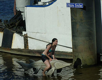 ![]() Abkühlung in der Oste (Fotos: Barbara Gehring) ![]() Nach dem Ritt auf dem Stördenkmal... ![]() ... Erfrischung im Osteschlick 4. 8. 2013. Zu den Fotos von den drei Nixen am und auf dem Oberndorfer Stördenkmal am Restaurantschiff "Ostekieker" schreibt oste.de-Leserin Barbara Gehring aus Hemmoor: "'Hein Stör' wurde heute geentert. Und man kühlte sich im Schlick... Hoffentlich bleibt der Sommer noch lange."