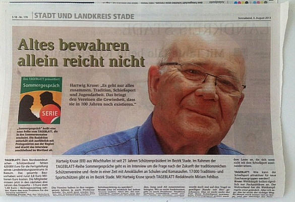 ![]() Lesetipp: Präsident Kruse im Interview 4. 8. 2013. Heiss diskutiert wird an diesen heissen Schützenfest-Wochenenden fast überall an der Oste die Existenzkrise vieler ländlicher Schützenvereine, eines wichtigen Teils der Dorfkultur. Zu diesem Thema hat nicht nur der Ostener Schützenpräsident Wilfried Röndigs Stellung genommen (siehe unten), auch das Stader Tageblatt greift es an diesem Wochenende in einem ganzseitigen Beitrag auf. In einem sehr lesenswerten Gespräch mit Redakteurin Miriam Fehlbus äußert sich Hartwig Kruse aus Wischhafen, langjähriger Stader Bezirksschützenpräsident, zu Themen wie dem anhaltenden Mitgliederschwund, Nachwuchs- und Imageproblemen (Komasaufen, Amokläufe), "königlosen" Vereinen und dem Spannungsverhältnis zwischen Sportschießen und und Traditionspflege. Kruses Kernaussage: "Altes bewahren allein reicht nicht." Was stirbt als nächstes? ![]() Autor Röndigs (r., mit Vorgänger Guthahn) "Mit Sorge lese ich Zeitungsberichte über abgelaufene Schützenfeste. Hier kein König, dort keine Königin und manchmal auch gar keine Majestäten. Und letztes Jahr hatten wir sogar eine Vereinsauflösung in unserer Nachbargemeinde. Soll es uns genau so ergehen? Der Trend zeichnet sich leider so ab. Lasst uns alle dagegen steuern und unser Ostener Schützenfest nicht sterben. ![]() Schützen-Majestäten in Osten/Oste Das Schützenfest ist nun mal ein Fest mit viel Tradition, aber auch mit viel Geselligkeit, und Geselligkeit lebt man nicht zu Hause allein oder zu zweit vor dem Fernseher. Genauso gut könnte man auch mit Freunden, Nachbarn oder Bekannten in dem "Osteland-Festhaus" Schützenfest feiern. Es muss ja nicht immer bis in den frühen Morgen sein (Wäre natürlich schön). Und mit dem Alkohol hat das auch jeder selbst in der Hand. Ihr müsst Euch nicht besonders herausputzen. Die Zeit der langen Ballkleider liegt hinter uns. Kommt einfach ganz leger, oder in Uniform, Hauptsache Ihr kommt. Früher nahm man Urlaub, um Schützenfest zu feiern. Heute nehmen einige Urlaub um vor dem Schützenfest zu fliehen. Können wir so unsere Feste aufrecht erhalten? ![]() VIDEO: Schützen-Umzug an der Oste (Neuhaus 2013) Der Sparclubball ist weg, der Schützenball ist weg, der Rot-Kreuz-Ball ist weg, der Sportlerball ist weg, der Silvesterball ist weg. Was stirbt als nächstes? Nur Du kannst es verhindern, mach einfach mit und geh hin. Wir möchten dieses 139. Schützenfest in dörflicher Gemeinschaft mit allen großen und kleinen Gästen feiern. Ich bitte euch, die Häuser und Straßen wie in allen Jahren wieder festlich zu schmücken. Verwandelt unser schönes Osten wieder in ein buntes Fahnen- und Blütenmeer. In dem "Osteland-Festhaus", am Schießstand und auf dem Festplatz werden die Festwirte und Schausteller mit ihren Betrieben um Euer Wohl bemüht sein. An allen drei Abenden ist Tanz in der Festhalle bei freiem Eintritt. Also gebt Euch einen Ruck und macht alle mit. Ein großer Dank gilt den vielen Stiftern der Ehrenpreise und der Beteiligung der Bevölkerung beim Vorverkauf der Tombola-Lose. An alle, die an den Umzügen nicht teilnehmen, oder nicht teilnehmen können, stellt euch vor Eure Häuser und winkt uns zu. Wir winken zurück. Ich wünsche uns allen ein fröhliches, faires und stimmungsvolles Schützenfest 2013."