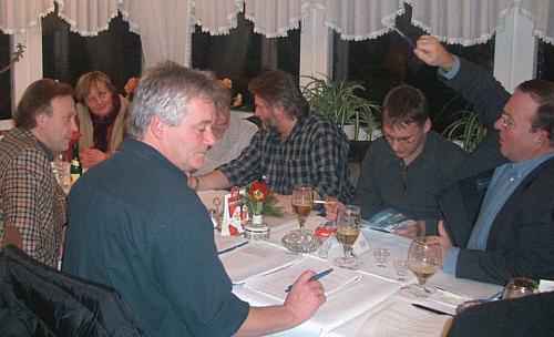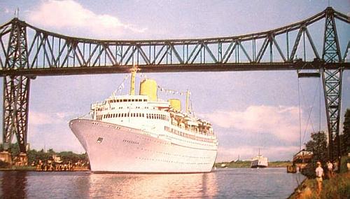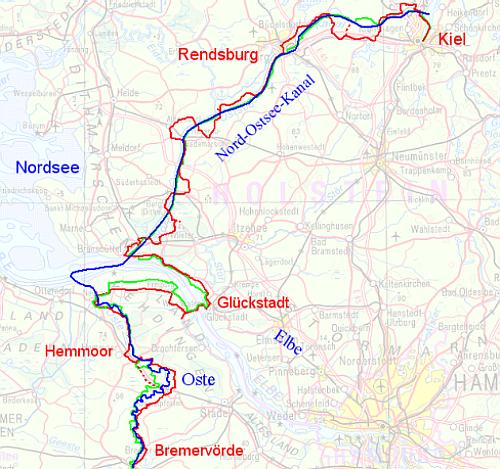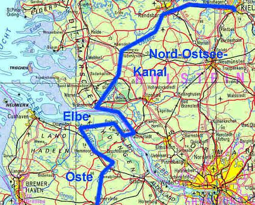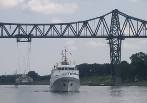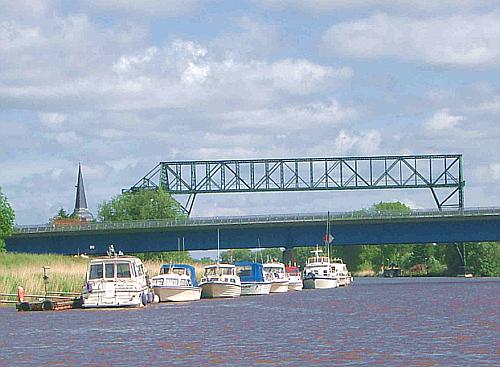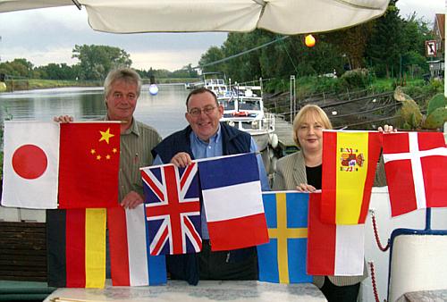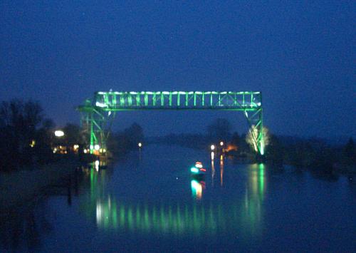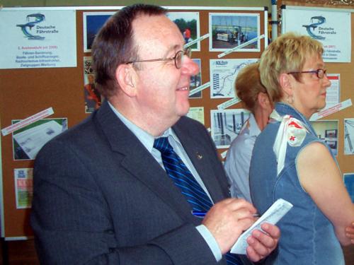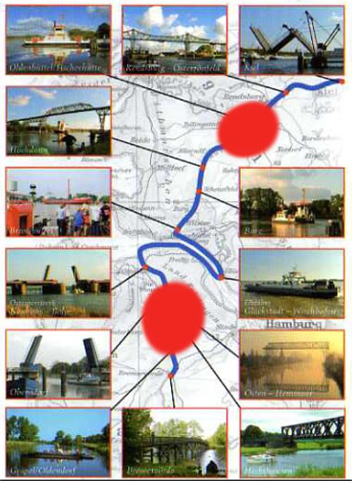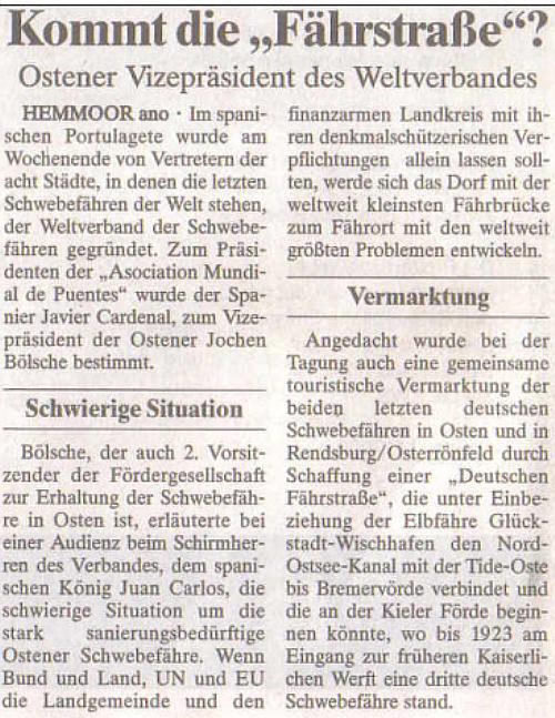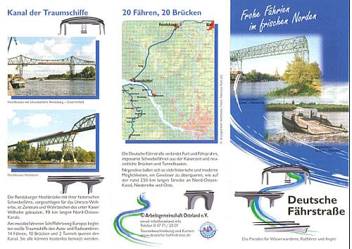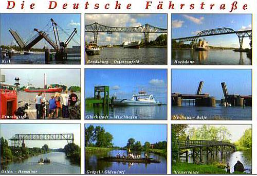 Dieser Mann wurde Vizepräsident des Weltverbandes. Er überzeugte die Bürgermeister der Schwebefähren-Standorte in Deutschland, hier im Bild zu sehen, von diesem Projekt Deutschen Fährstrasse. Sofort nach seiner Rückkehr aus Spanien entwickelte er in kürzester Zeit eine umfangreiche Projektstudie zu diesem Thema. Diese Studie erging an rund 100 wichtige Persönlichkeiten des öffentlichen Lebens, sowie an sämtliche kommunalen Entscheidungsträger unserer Region. Die richtige Auswahl der Empfänger war für den ersten Impuls extrem wichtig. Leitfaden dieser Studie war �die Strasse der Kontraste� . Sie zeigt Historisches... ... und moderne Technik, ... ... Elegantes, ... ... sogar Bizarres ... ... und Idyllisches. Und entsprechend ihrem Namen auch hier und da eine richtige Fähre. Hier die 'Stena Germanica' am Endpunkt der Route im Kieler Fährhafen. Sie bedient täglich die Verbindung Kiel-Göteborg in Schweden. Die Studie sah drei Routen für differente Ansprüche vor. Die blaue für Wasserwanderer, die rote für Autos und Wohnmobile und die grüne für die Radfahrer. Die Organisation begann. Wir stellten fest, dass im Nordabschnitt, am Kiel-Kanal, bereits eine Fahrradroute existierte. Hier ist der Tourismus wesentlich weiter gediehen als in unserer Region. Eine professionelle Tourist-Info in Rendsburg plant und koordiniert die Angebote. Für die Einrichtung der Süd-Route entlang des Flusses Oste wurde im Januar 2004 ein Verein gegründet. Die 'Arbeitsgemeinschaft Osteland'. Der Gründungsversammlung, die dieses Bild zeigt, gehörten elf Mitglieder an. Inzwischen haben wir ca. 170 Mitglieder, die alle gemeinnützig und ehrenamtlich arbeiten. Der Start erfolgte ehrenamtlich und ist es bis heute geblieben. Die Grafik-Abteilung einer Druckerei entwarf unser Logo, welches aus den vorherrschenden Farben der Region, blau und grün, den Fluss und das Land formt, und in Grau Schwebefähre, Brücke und Schiff stilisiert. Für den Entwurf brauchten wir nichts zu bezahlen, da der Firmeninhaber gleichzeitig Vorstandsmitglied bei uns ist. Der geniale Slogan �Frohe Fährien im frischen Norden� wurde begeistert von lokaler, regionaler und landesweiter Presse aufgenommen. �Fährien� ist ein Kunstwort aus �Ferien� und �Fähre�. Wir entwarfen unsere Website...