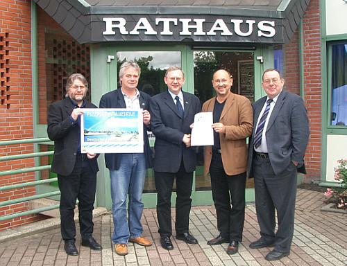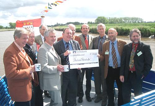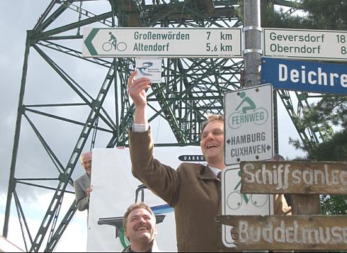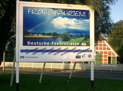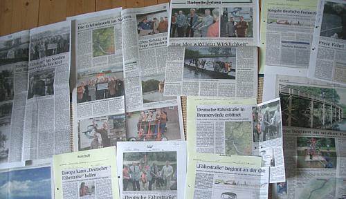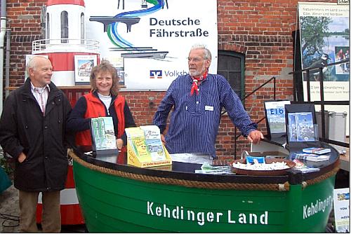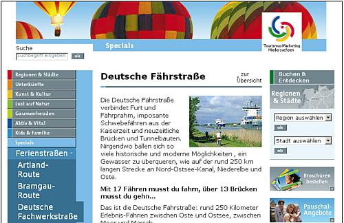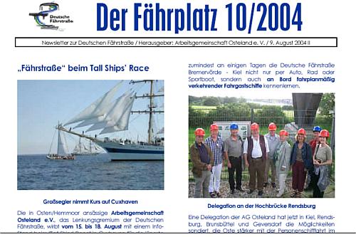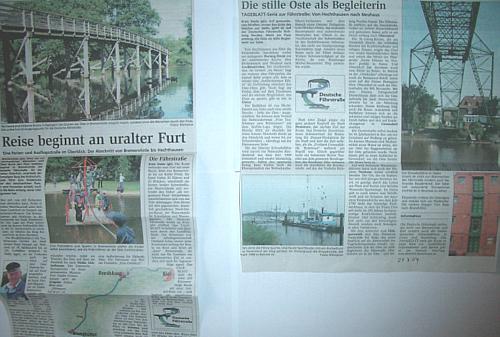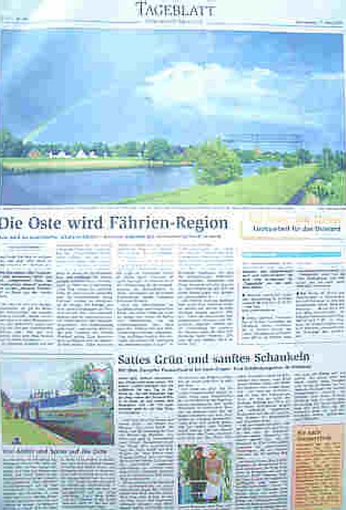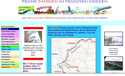 Viel schneller als einige dachten, eröffneten wir im Mai 2004 mit ca. 200 geladenen Gästen unsere 'Fährienroute'. Der sympathische Start gelang uns am gedachten Startpunkt, einer Spielfähre für Kinder in Bremervörde. Das mediale Echo war enorm. Presse, Funk und Fernsehen berichteten ausführlich davon. Eine alte Fähre, die noch per Hand durch den Fluss gezogen wird, war eine der Attraktionen. Die Bürgermeister der beiden Schwebefähren-Standorte nahmen symbolisch die erste Ausschilderung vor. Auf diesem Bild sehen sie einen Ausschnitt der Zeitungsmeldungen über diesen Tag. Leider bei weitem nicht vollständig. Nach diesem viel beachteten Start gingen wir an den weiteren Ausbau unseres Projektes. Wir erstellten eine themenspezifischen Flyer für die Route der Wohnmobile. Wir begrüßten die Bürgermeister aller Anrainergemeinden entlang des Flusses als neue Mitglieder in der Arbeitsgemeinschaft Osteland. Wir gewannen eine große Bank als unseren Hauptsponsor. Hier zu sehen der Bankvorstand bei der Scheckübergabe. Wir konnten die Radwegbeschilderung erfolgreich abschließen... ... und die Autoroute im Südabschnitt ausschildern. Natürlich mit dem Hinweis auf unsere Website. Nach diesen fundamentalen Maßnahmen gingen wir die Verbesserung unseres Außenauftrittes an. Die Route war da. Und � wichtig � die Ausschilderung war da. Nur das, was man anfassen kann, existiert wirklich. Wir verbesserten unsere Internet-Präsenz. Auch schlossen wir schon frühzeitig die deutschen Tourismuszentralen in unseren E-Mail Verteiler ein. Unsere regelmäßigen Newsletter, aber wohl auch das Produkt selbst erwirkten die Aufnahme in die TOP 50 der Ferienstraßen in Deutschland. Und es gibt ungleich mehr in unserem Land. Ein Ritterschlag für uns. Geben sie heute den Begriff �Deutsche Fährstrasse� bei Google ein, erhalten sie mehr als 12.800 Nennungen... ... sogar auf japanisch. Auch die eben schon erwähnte �Deutsche Tourismuszentrale� veröffentlicht die Fährstrassen-Site auf japanisch. Und in weiteren 10 Sprachen. Der Wert ist unschätzbar für das internationale Incoming-Geschäft. Gleichwohl blieben wir bodenständig und setzten unsere Pressearbeit kontinuierlich fort. Regelmäßig, heißt ca. einmal in zwei Wochen, erhalten die Blätter fertige redaktionelle Beiträge von uns. Auch das