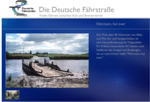 Die erfolgreiche erste Bewerbung des Projektes war äußerst wichtig. Nach dem Motto �Wir haben nur einen Schuss� warben wir sehr effektiv für unser Projekt. In einer Auflage von 100.000 Exemplaren erstellten wir den ersten Promotion-Flyer. Unsere Video-Präsentation der �Deutschen Fährstrasse� war ein Riesenerfolg. Ich werde sie ihnen zum Schluss noch zeigen. Laufzeit etwa 12 Minuten. Hier zeigte sich, welche Macht Bild und Ton haben, und welchen entscheidenden Vorteil sie gegenüber Wort und Papier haben. Stellen sie sich bitte folgendes Szenario vor: Eine eingefahrene, trockene, von Regularien und Formalien erfüllte Ratssitzung der mitunter recht gelangweilten Entscheidungsträger. In solch einer erscheinen die Macher einer innovativen Idee, die als solche schon Interesse erzeugt. Und � noch innovativer � sie wollen kein Geld. Nur Engagement. Die erzählen von Fähren in ganz Europa, sogar vom König in Spanien, und belegen ihr Engagement mit einer höchst professionellen Video-Show. Wie es eine regionale Tageszeitung auf den Punkt brachte: �Der Rat war entzückt�. Die Präsenz auf regionalen und überregionalen Messen ist extrem wichtig, weil man hier den direkten Kontakt zum Kunden findet. Wichtig ist ein professionelles und sympathisches Layout des Messestandes. Ebenfalls sehr wichtig die personelle Besetzung. Auch die Feste in der Region müssen besetzt sein. Auch hier erscheinen Touristen, aber auch unsere Mitbürger, die ebenfalls überzeugt werden müssen. Ein kompakter, aber inhaltlich mächtiger Newsletter, per Email an alle vorhandenen Adressen im Turnus von ca. 3 Monaten versandt, ist das Rückgrat des Informationsflusses.