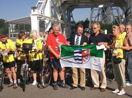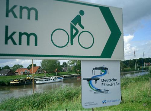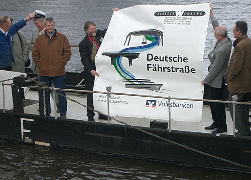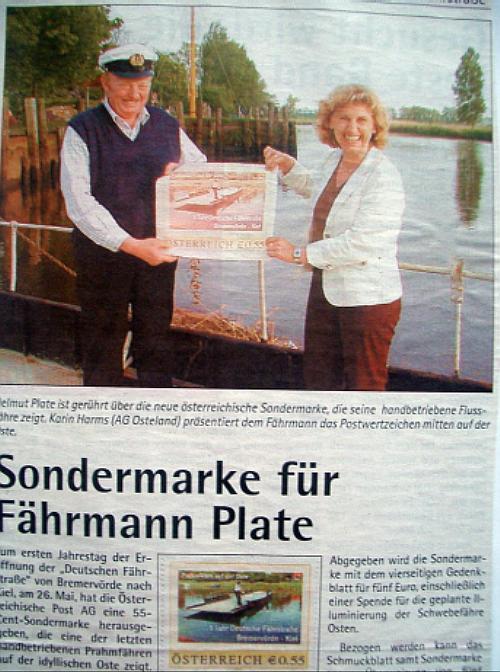 Die Routenpläne im Internet erscheinen inzwischen interaktiv. Neben den fundamentalen Dingen, die zu erarbeiten sind, zählt die Kreativität der Mitstreiter in einem hohen Maß. Hierfür möchte ich ihnen einige Beispiele geben. Eine Idee war, einen Postkartenverlag im Nordabschnitt für uns zu gewinnen. Das gelang, und seit etwa 2 Jahren erscheinen in diesem Verlag Postkarten der �Deutschen Fährstraße�, welche überall im Nordabschnitt zu erwerben sind. Ein ansässiger Künstler wurde unser Mitglied und entwirft wunderbare Postkarten und Plakate für uns. Eine phantastische Aussenwirkung haben Großplakate. Im Format 3x4 Meter wurden diese an ausgewählten Standorten aufgestellt und weisen den Durchgangsverkehr auf unser Projekt hin. Kosten ca. 500 EUR pro Stellwand inkl. Plakat. Wir versuchten vergeblich, die Deutsche Post zu bewegen, eine Sonderbriefmarke über die Fährstraße heraus zu geben. In Deutschland ist die Hoheit über die Gestaltung von Sondermarken ausschließlich dort verankert. Und diese Deutsche Post ist ein wahrlich starres Gebilde. In Österreich, unserem gebirgigen Nachbarland im Süden, ist dies anders. Dort kann man, gegen entsprechendes Salär, eine Briefmarke drucken lassen und diese offiziell veröffentlichen. Die Geldbörse bestimmt die Auflage. Zum einjährigen Jubiläum unserer Fährstraße legten wir also eine österreichische Briefmarke im Wert von 55 Eurocent auf. Das Motiv zeigt eines der Highlights der Route, einen alten, bodenständigen Fährmann, der seine Fähre noch per Hand über den Fluss zieht. Die Auflage verkauften wir gegen einen entsprechenden Aufpreis. Sie war binnen kürzester Zeit vergriffen. Unser regionaler Radlerclub warb sehr sympathisch für uns. Mit etwa 20 Mitgliedern führte er eine �Erstbefahrung� der Fährstraße durch. Die Radler waren sehr angetan von der Route, die Presse von den Radlern auch.