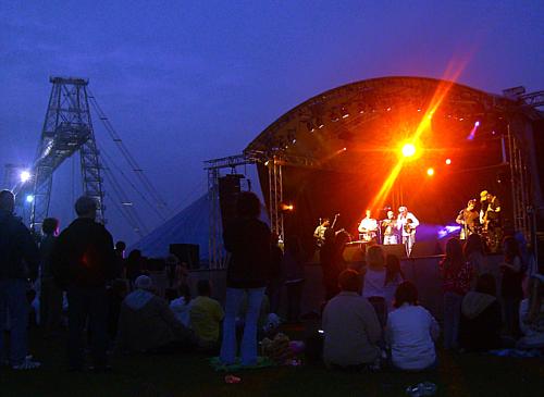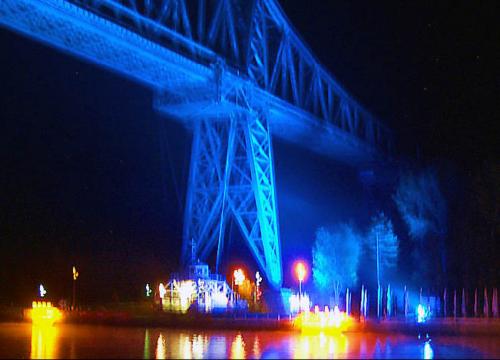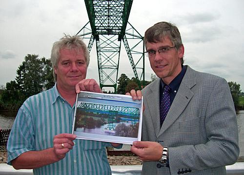 Insgesamt waren 1.6 Mio. EUR Baukosten veranschlagt. Dieser immense Betrag wurde durch eine Mitarbeiterin des Landkreises eingeworben, welche ebenfalls Mitglied bei uns ist. Die Wiedereröffnung feierten wir im April 2006. Seitdem konnten wir ca. 35.000 Besucher und Fahrgäste begrüßen. Für die Anschaffung von 6 Scheinwerfen für die Illuminierung der Fähre gingen wir und unsere Freunde bei der hiesigen Wirtschaft �betteln�. Innerhalb kurzer Zeit hatten wir die erforderlichen 3000 EUR beisammen. Wenn Sie das Bild betrachten, werden sie sicher zustimmen, dass sich diese Investition gelohnt hat. Ebenfalls warben wir 500 EUR für Anschaffung und Inbetriebnahme einer Webcam ein. Diese wurde im September 2006 in einem Fenster des Ostener Kirchturms installiert. Die Cam aktualisiert ca. alle 10 Sekunden. Im Bild der Bürgermeister der Samtgemeinde Hemmoor mit einer Hardcopy des ersten Bildes der Kamera. Selbst diese relativ kleine Maßnahme erzeugte ein entsprechendes Echo in den Medien. Abschließend ein Ausblick auf unsere mittelfristigen Ziele. Unser 2.Vorsitzender, Herr Jochen Bölsche, der übrigens diese Slides zusammengestellt hat und von dem ich sie herzlich grüßen möchte, besuchte im Herbst letzten Jahres die Standorte der englischen Schwebefähren, darunter auch die Stadt Middlesbrough. Er war beeindruckt von der Ausstattung des örtlichen �Visitors' Center�. Wir sind bemüht, auch bei uns ein Visitors' Center mit angegliedertem Fährmuseum zu errichten. Hier befinden wir uns aktuell mit der Kommune in der Planungsphase. Auf dem Gelände der Fähre wurde das 100-jährige Bestehen der Fähre mit einem riesigen Fest gefeiert. Selbst englische Pop-Größen traten hier auf.