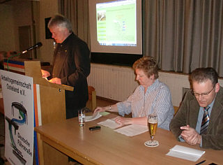 ![]() Verwaltungsrechtlerin Karin Ritter Bei allen Bemühungen um neue Feriengäste müsse jedoch der Charakter der naturnahen Oste bewahrt und daher "sanfter Tourismus" angestrebt werden. Aus diesem Grund begrüßt die AG Osteland, dass ein Befahren des Flusses mit Jet- und Wasserski in der geplanten neuen Oste-Verordnung eindeutig untersagt werden soll, wie die von der Seglergemeinschaft Oberndorf (SGO) eingeschaltete Oberndorfer Rechtsanwältin und Verwaltungsrechtlerin Karin Ritter die aktuelle Haltung des Landes wiedergab. Aufgrund vieler Einwände aus der Bevölkerung seien dem Verordnungsentwurf "dieser und andere Giftzähne gezogen" worden, freut sich die AG Osteland. ![]() "Gelbe Welle" in Bremervörde Über günstige Möglichkeiten, Sportboothäfen an der Oste im Rahmen des Programms "Gelbe Welle" (Website) zu zertifizieren und überregional bewerben, informierte die Fachbereichsleiterin Bianka Zydek von der Stadt Bremervörde. Die Vördestadt hatte sich bereits 2008 der "Gelben Welle" angeschlossen und gute Erfahrungen mit dem deutschlandweit bereits von rund 480 Häfen genutzten Projekt gesammelt, die zur Nachahmung anregten. ![]() Fachbereichsleiterin Bianka Zydek Auch die Samtgemeinde Am Dobrock strebe eine Einbeziehung ihrer Häfen in das Programm an, berichtete der Wingster Touristiker Michael Johnen. ![]() Bürgermeister Martens, Clipper-Segler Köpke Zu Beginn der Veranstaltung hatte der Neuhäuser Bürgermeister Georg Martens die Mitglieder des "Blauen Netzes Oste" begrüßt und den traditionsreichen Hafenort vorgestellt, der heute über zwei Sportboothäfen sowie über eine Wasserskianlage auf dem Ostesee verfügt. Die beiden Häfen würden alljährlich von insgesamt rund 750 Gast-Yachten angesteuert. Das "Tor zur Oste" sei zudem ein zunehmend beliebter Anlaufpunkt für Wohnmobilisten, sagte der Bürgermeister. "Unsere Häfen müssen mehr zum Verweilen einladen und dürfen an Gastfreundschaft nicht zu übertreffen sein," forderte Fachgruppensprecher Jürgens. Dass jedenfalls Neuhaus schon jetzt den Anforderungen genügt, machte Dieter Köpke (Oberndorf) von der "Clipper-Crew Hadeln" deutlich: Zum Dank für die Gastfreundschaft des Fleckens beim Besuch der "Albatros" im vorigen Jahr überreichte Köpcke dem Bürgermeister ein preisgekröntes Großfoto des Traditionsseglers. ![]() Hermann Toedter zeigte die Obere Oste Abschluss und Höhepunkt der Fachgruppensitzung war eine Videopräsentation des Zevener Naturfotografen Hermann Tödter (Website) zum Thema "Die Oste - Faszination einer Landschaft". ![]() Naturfotograf Toedter im Ehefrau in Neuhaus Tödter brachte den Zuschauern mit teils atemberaubend schönen Bildern von der Oberen Oste eine Stunde lang die "ganz besondere Schatzkiste der Natur" nahe, die der Oberlauf bietet, an dem Raritäten wie der Eisvogel und sogar der Schwarzstorch anzutreffen sind. Den begeisterten Zuschauern riet Toedter: "Sparen Sie Geld, machen Sie dieses Jahr mal Urlaub an der Oste." ![]() So berichtet die NEZ - grösser Presseberichte über die Vorbereitung und Gründung des "Blauen Netzes" stehen hier.