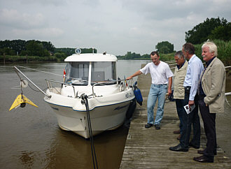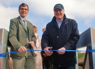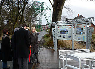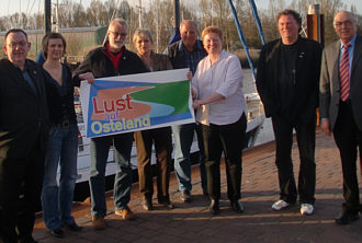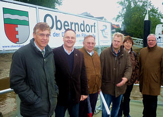 ![]() Eröffnung des Schiffsanlegers in Osten Zuversichtlich stimmen den Verein, so dessen Sprecher Jochen Bölsche (Osten), unter anderem die Bemühungen der Touristiker im Landkreis Rotenburg, die Landschaft am Oberlauf von Oste und Wümme als "Flachlandwanderregion Nummer eins" in Norddeutschland zu profilieren. Der Tourismus an der Unteren Oste wiederum, in den Landkreisen Stade und Cuxhaven, könne von der lange geforderten und schliesslich im April 2010 erfolgten Eröffnung zweier moderner Fahrgastschiffanleger in Osten und Hechthausen-Klint (Samtgemeinde Hemmoor) profitieren. Ein weiterer Anleger für Schiffe wie den Oste-Oldtimer "Mocambo" soll im Frühjahr in Großenwörden (Samtgemeinde Himmelpforten) folgen; alle Anleger am Fluss sind von der AG Osteland mit einheitlichen Stationsschildern versehen worden. "Oste-Trail" findet