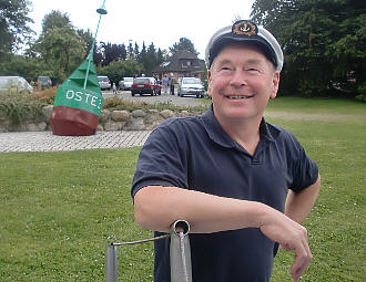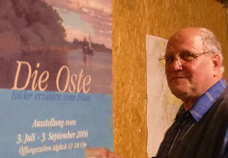 ![]() Jürgens mit der neuen Fahne 23. 4. 2010. Zeigt Flagge für die Oste! Bernd Jürgens, Sprecher der Osteland-Fachgruppe Blaues Netz, hat kürzlich neue Fahnen und Wimpel vorgestellt, die sich an jedem Boot, in jedem Hafen gut machen - aber auch an Flaggenmasten vor Rathäusern, in Gärten usw. Bestellungen