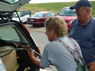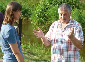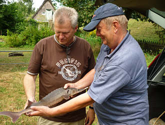 ![]() Störvater Schütz mit Direktorin Dr. Häse 16. 7. 2010. Der in der Elbe gefangene Stör "Luise" hat seit Donnerstag ein neues Quartier: Die Direktorin des Natureums Niederelbe in Balje, Dr. Clivia Häse, hat dem Sibirischen Stör im Naturkundemuseum auf der Osteinsel "Asyl" gewährt. Zur Übergabe des Fisches durch Wolfgang Schütz (Osten, AK Wanderfische) und Albertus Lemke (Oberndorf, AG Osteland) hatte sich auch Häses Vorgänger Dr. Reinhard Kölmel eingefunden.