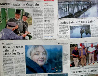 ![]() Einige Schlagzeilen vom Jahresende 5. 1. 2010. "Ein stiller Fluss macht von sich reden" - unter dieser Überschrift berichtet nun auch der Weser-Kurier / Wümme-Zeitung über die Oste. "Die Oste war bisher eher ein Tipp für Insider. Das hat sich im vergangenen Jahr gründlich geändert. Der rund 150 Kilometer lange Fluss, der südlich von Tostedt entspringt und bei Neuhaus in die Elbe mündet, hat einen gewaltigen Sprung gemacht," urteilt Autor Klaus Göckeritz in einem ausführlichen Artikel (hier im Netz) zum Abschluss des Oste-Jahres. Weiter heisst es in der Bremer Zeitung: "In unserer Region ist die Oste zwischen Zeven, Rockstedt, Selsingen und Bremervörde ein Geheimtipp für Wasserwanderer und Kanuten." Damit haben - neben diversen Hörfunkstationen - nun praktisch sämtliche Zeitungen im Elbe-Weser-Dreieck über den Abschluss des Jahres der Oste berichtet, darunter - das Hamburger Abendblatt