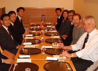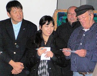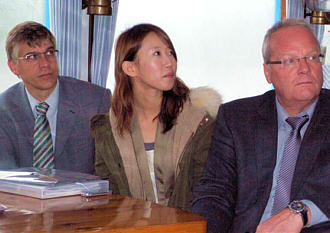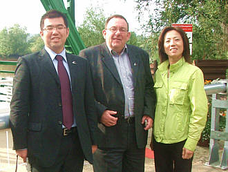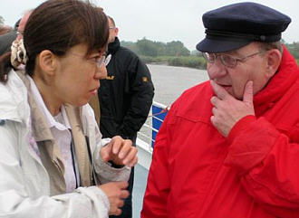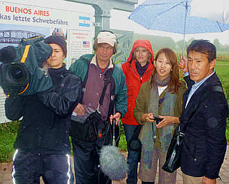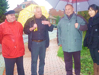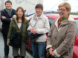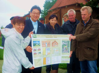 ![]() TV-Dreh auf der Schwebefähren-Infomeile Ähnlich wie die von der Arbeitsgemeinschaft Osteland ehrenamtlich konzipierte maritime "Fährienstraße", die rund 50 Fähren, Brücken, Schleusen, Sperrwerke, Furten und Kanaltunnel verbindet, seien auch die Ferienrouten auf Hokkaido nach dem Prinzip "Locals take leadership" durch Initiative "von unten" entstanden, berichteten Generalsekretärin Keiko Kato vom "Scenic Byways Resource Center" und Dr. Yoko Shintani vom "Hokkaido Development Engineering Center", beide ansässig in Sapporo. ![]() Dr. Yoko Shintani mit Osteland-Vize Bölsche Auch der deutsche Touristiker und AG-Osteland-Vorsitzende Gerald Tielebörger (Wingst) sah bei einem Fachgespräch im Alten Rathaus in Rendsburg "ganz verblüffende Parallelen" zwischen den jeweils im Jahre 2004 gestarteten norddeutschen und nordjapanischen Bemühungen, die darauf zielen, insbesondere zentrumsfernen, bevölkerungsschwachen, landwirtschaftlich geprägten Gegenden durch Ferienstraßen, sanften Tourismus und die Inwertsetzung regionaler Besonderheiten zu einem zweiten Standbein zu verhelfen. ![]() Schwebefähren-Infomeile in Basbeck Auf ihrer Reise durch Norddeutschland waren die Gäste aus Japan zunächst von AG-Osteland-Vize Jochen Bölsche am nationalen Baudenkmal Schwebefähre Osten-Hemmoor über die rund 250 Kilometer lange Ferienstraße und die "Internationale Schwebefähren-Infomeile" informiert worden. Dabei erläuterte er auch die "Philosophie" der von ihm 2003 entworfenen Fährstraße. "Weltweit einzigartig", so Bölsche, sei das zugrunde liegende Konzept, an einer einzigen Themenroute "alle Möglichkeiten darzustellen, die der Mensch je ersonnen hat, um ein Gewässer zu queren" - von der Furt über Kahn- und Prahmfähren bis hin zu Schwebefähren, Tunneln, High-Tech-Brücken und den gigantischen "Kreuzfährschiffen", die Kiel mit Skandinavien verbinden. ![]() Saul mit Dolmetscherin Yuka Shiraishi Bereits am Bahnhof hatte Bürgermeister Hans Wilhelm Saul (Hemmoor) die Gäste begrüßt. "Wir sind froh und glücklich darüber, dass die Deutsche Fährstraße und die Internationale Schwebefähren-Infomeile in Hemmoor sogar in Japan Resonanz finden," sagte Saul. ![]() Emma Tielebörger begrüßt die Japaner Auf der Schwebefähre Osten - Hemmoor gab die siebenjährige Emma Tielebörger, Tochter des AG-Osteland-Vorsitzenden, das Glockensignal zur Abfahrt. Ihr Großvater Erich Meyer - ebenso wie Emma zünftig ausgestattet mit Fischerhemd und Elbsegler - legte einen Hebel um, und die Gondel der 101 Jahre alten Fähre schwebte langsam nach Osten. ![]() Heimatpfleger Frank Auf dem Felde Nach der Begrüßung der Gäste durch die Fährvereinsvorsitzenden Horst Ahlf und Karl-Heinz Brinkmann präsentierte Heimatpfleger Frank Auf dem Felde in der "Fährstuuv" die von ihm zusammengestellte Dauerausstellung über die Geschichte der Schwebefähre. Der Tag endete für die japanischen Touristikexperten mit einer Einladung der AG Osteland zu einem Abendessen im Hotel "Fährkrug", bei dem sich die Gäste überwiegend für Fischgerichte entschieden - und des Lobes voll waren für die Küche des Traditionsrestaurants. Ihr Urteil fassten sie in ein schnell erlerntes deutsches Wort: "Lecker!" ![]() Mocambo-Fahrgäste Brauer und Gummich Auf dem Oste-Oldtimer "Mocambo", auf dem Kapitän Caspar Bingemer die Gruppe willkommen hieß, wurde die Studienfahrt anderntags mit einem Fachgespräch über die Effekte der Ferienstraße fortgesetzt. Dazu hatten sich neben den Bürgermeistern der beiden niedersächsischen Schwebefähren-Orte, Hubert und Saul, auch deren Kollegen Eduard Gummich (Stadt Bremervörde), Detlef Horeis (Gemeinde Oberndorf), Bettina Gallinat (Samtgemeinde Am Dobrock) und Dirk Brauer (Samtgemeinde Hemmoor) eingefunden. ![]() Empfang durch sechs Bürgermeister Der Hemmoorer Kommunalpolitiker und Osteland-Schatzmeister Johannes Schmidt hob hervor, die "Fährienstraße" habe dazu beigetragen, dass bereits über eine Million Euro für die Förderung von Schiffsanlegern ins Osteland geflossen seien. Der Ostener Bürgermeister Carsten Hubert zeigte sich erfreut darüber, dass die Ferienroute nicht nur vermehrt Touristen in die Region bringe, sondern auch dazu geführt habe, dass die Gemeinden am Fluss in überregionale Infrastruktur-Förderprogramme aufgenommen worden seien. Albertus Lemke (r.) serviert Räucherfisch Auf wie vielfältige Weise das Thema Gewässerquerungen, das Leitmotiv der Deutschen Fährstraße, umgesetzt werden kann, erfuhren die ausländischen Gäste in Oberndorf, wo sie von AG-Osteland-Mitglied Albertus Lemke mit selbstgeräuchertem Oste-Aal und Oste-Lachs sowie mit Osteland-Aquavit (mit eigens gefertigtem japanischem Etikett!) bewirtet wurden. ![]() Osteland-Aquavit mit Spezialetikett Zwischen dem Restaurantschiff "Ostekieker", einer ehemaligen Warnow-Fähre, und der Klappbrücke über die Oste war kurz zuvor das Fundament für einen verkleinerten Nachbau der historischen Oberndorfer Prahmfähre gelegt worden. Das Fährdenkmal soll, wie Lemke erläuterte, durch zwei spendenfinanzierte Holzstatuen ergänzt werden, die einen traditionell gekleideten Fährmann sowie den wohl berühmtesten Oberndorfer Fährgast darstellen, den Deutschlandlied-Dichter Heinrich Hoffmann von Fallersleben. ![]() Detlef Horeis (r.) mit Störzentrum-Plan Vom Standort eines ebenfalls geplanten Oberndorfer "Stör- und Sportfischer- Informationszentrums", zu dem Bürgermeister Horeis erste Ideenskizzen vorstellte, ging es per Bus weiter zur Elbfähre Glückstadt - Wischhafen, wo die Gäste von Geschäftsführerin und Osteland-Sponsorin Hildegard Both-Walberg willkommen geheißen wurden. ![]() Freut sich: Elbfähren-Chefin Both-Walberg Auf der Elbfähre, aber auch auf den Autofähren im Nord-Ostsee-Kanal erschlossen sich den Reisenden die maritimen Reize der Region. Die schwimmenden Giganten auf dem Kanal, der meistbefahrenen künstlichen Wasserstraße der Welt, veranlaßten die Besucher aus Fernost immer wieder, di