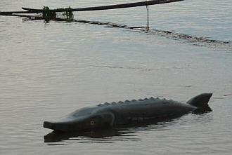 ![]() Ostener Exponat: Störfilet aus China 30. 7. 2010. Die Ausstellung "Der Stör - Die Rückkehr des grauen Riesen - Ausrottung und Rettungsversuch" in der musealen "Fährstuv" an der Ostener Schwebefähre wird bis Sonntag, 15. August, verlängert. Die Stör-Schau, die von Jochen Bölsche der AG Osteland und Wolfgang Schütz von der Arge Wanderfische Oste zusamengestellt worden ist, kann täglich von 11 bis 17 Uhr besichtigt werden; der Eintritt ist frei. TV-Dreh an Bord Im August plant ein NDR-TV-Team um Larissa Scheler Dreharbeiten in der Fährstuv und an Bord des Forschungsbootes "Acipenser", das den experimentellen Störbesatz in der Oste begleitet. Die Aufnahmen sollen im Rahmen einer 45-minütigen Sendung über Kehdingen und das Osteland im N3-Reisemagazin "Nordsee-Report" ausgestrahlt werden.