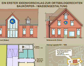 ![]() Entwurf für Stör-Infozentrum in Oberndorf Begrüßt werden von der AG Osteland in diesem Zusammenhang Bemühungen ihrer Mitgliedsgemeinde Oberndorf, die seit 2009 auch Standort eines von Vereinsmitgliedern gestifteten Stördenkmals ist und die nun die Schaffung eines Stör- und Sportfischer-Informationszentrums anstrebt. Als beispielhaft bewertet die AG Osteland auch das im Dezember in Blumenthal (Landkreis Stade) eröffnete erste wanderfischdurchlässige Oste-Schöpfwerk durch den Deichverband Kehdingen-Oste. "Blaues Netz Oste"