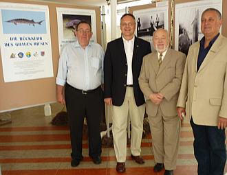 ![]() Initiatoren der Ostener Störausstellung Eine Ostener Ausstellung mit dem Titel "Die Rückkehr des grauen Riesen", die von der AG Osteland und dem von ihr mitbegründeten Arbeitskreis Wanderfische Oste unter Leitung von Wolfgang Schütz gestaltet worden ist, wurde von Vertretern der Umweltministerien in Berlin und Hannover sowie von Artenschutz-Experten aus Frankreich und den Niederlanden besucht. Veranstaltungen in Bremervörde, Balje, Oberndorf und Osten sowie ein "Störgipfel" in Großenwörden informierten über die 2010 in Offensen (Kreis Rotenburg) fortgesetzten Besatzaktionen in der 150 Kilometer langen Oste, die laut Bundesamt für Naturschutz einen "wichtigen Beitrag zum Schutz der globalen Biodiversität" darstellen. (Mehr über den Kampf um die Rückkehr des Oste-Störs auf dieser 2001 gestarteten SONDERSEITE).