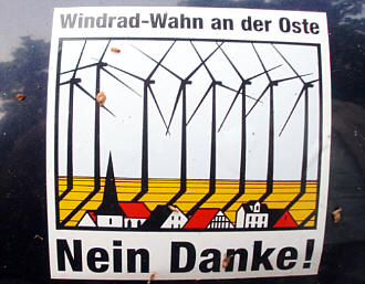 ![]() Protest gegen Windparks an der Oste Auch auf die "Bedrohung unserer Landschaft" ging der Osteland-Sprecher ein: "Auch wer die Erneuerbaren Energien für unverzichtbar hält, muss vor falschen Standortentscheidungen und schädlichen Ballungen warnen - ob es sich nun um die Biogasproduktion an der Oberen Oste handelt, wo der Landkreis Rotenburg landesweit den Platz 2 hinter dem Landkreis Cloppenburg einnimmt, oder ob es sich um Windkraftanlagen an der Unteren Oste handelt, die dreimal so hoch sind wie die Schwebefähre und die deren Einbeziehung in das Weltkulturerbe gefährden würden." Unbefriedigend sei auch die "Verkehrssituation im Osteland, dessen Orte zumeist keinem der großen Verkehrsverbünde angehören, so dass nicht nur HVV-Pendler, sondern auch Hamburger Touristen Wucherzuschläge zahlen müssen, wenn sie mit der Bahn nicht nur bis Himmelpforten fahren wollen, sondern zum Beispiel nach Hechthausen oder in die Wingst, ganz zu schweigen von dem 75 Jahre alten Nadelöhr an der noch immer kriegsversehrten, eingleisigen Ostebrücke in Hechthausen." Bölsche abschließend: "In solchen und vielen anderen Angelegenheiten werden wir uns zu Wort melden müssen, wenn wir bleiben wollen, was wir zu sein beanspruchen: die Lobby für das Osteland." - Der komplette Tätigkeitsbericht steht hier im Netz.