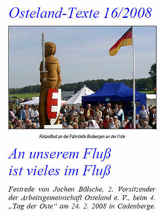 24. 2. 2008. Mit einer Rekordbeteiligung von fast 200 Vertretern aus Politik, Kultur, Wirtschaft und Vereinsleben endete am 24. Februar 2008 in Cadenberge (Kreis Cuxhaven) der 4. "Tag der Oste". Zum viertenmal vergab die gemeinnützige Arbeitsgemeinschaft Osteland e. V. für besondere Verdienste um die Flußregion den mit insgesamt 3000 Euro dotierten Kulturpreis "Der Goldene Hecht".