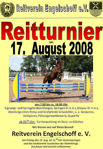 16. 6. 2008. Der Reitverein Engelschoff e. V. lud am Wochenende ein zu einem Fahrturnier mit Kreismeisterschaften für Ponys und Großpferde auf dem Fahrplatz von Heinz Koppelmann.