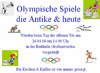 19. 6. 2008. Am gemeinsamen Voltigierturnier der Vereine Hechthausen und Großenwörden am Wochenende in der Halle des Reitvereins Hechthausen-Basbeck beteiligten sich rund 290 Kinder und Jugendliche. Über die A-Nachwuchsgruppen schreiben die Cuxhavener Nachrichten: "Ihre Pflichtund Kür-Elemente absolvierten sie mit Bravour im Schritt, wobei sich besonders die Gruppe aus Großenwörden auf dem Pferd Heike unter der Leitung der Trainerin Ria Bundt hervorhob." Mehr...
