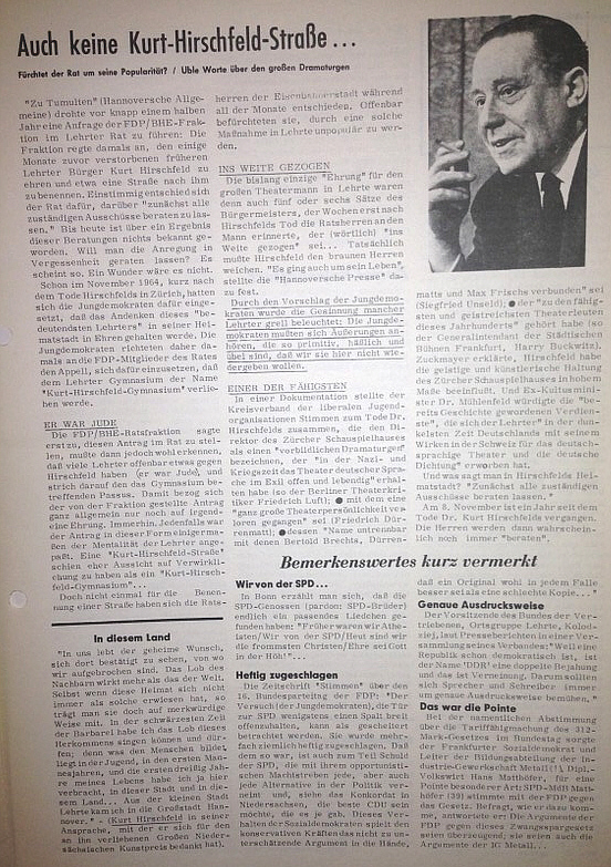 Die Festrede zum Hundertjährigen des Gymnasiums hielt Ministerin Ursula von der Leyen (Lehrter Abi-Jahrgang 1976) im "Kurt-Hirschfeld-Forum", in dem heute die Oberstufe, das Veranstaltungszentrum und die Musikschule der 40.000-Einwohner-Stadt untergebracht sind - und dessen Namensgebung in mir sehr gemischte Erinnerungen weckt. Als 19-jähriger Volontär der "Hannoverschen Allgemeinen" und damaliges Mitglied der linksliberalen, FDP-nahen Jungdemokraten hatte ich im Herbst 1964 angeregt, "mein" Gymnasium nach dem bedeutendsten Sohn der Stadt zu benennen: nach dem kurz zuvor verstorbenen, 1933 von den Nazis in die Emigration getriebenen großen Theatermann Kurt Hirschfeld, dessen Wirken als Direktor des Zürcher Schauspielhauses untrennbar mit den Namen von Zuckmayer, Dürrenmatt, Max Frisch und Bertolt Brecht verbunden war. Mein Namensvorschlag wurde in der teilweise noch NS-geprägten Lehrerschaft offenbar als Provokation empfunden: "Ein deutsches Gymnasium nach einem Juden benennen?". Ein FDP-Antrag im Rat der Stadt drohte - so damals die Lokalpresse - "zu Tumulten" zu führen. Nicht einmal eine Straße wollte die konservative Mehrheit Kurt Hirschfeld widmen.