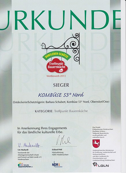 28. 11. 2013. Einen ersten Preis gewonnen hat das Team der Oberndorfer Gaststätte "Kombüse 53° Nord" im Wettbewerb "Land der verborgenen Schätze" der Arbeitsgemeinschaft Freizeit und Urlaub auf dem Lande und des NDR. Die Urkunde in der Kategorie "Bauernküche" nahm am Dienstag in Landesbergen bei Nienburg die Oberndorfer Kombüsen-Wirtin Barbara Schubert entgegen, die dem NDR-Publikum aus diesem Anlass das Projekt kurz vorstellen konnte.