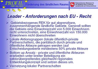 Im Detail heißt es zum Thema "Struktur und Kompetenz der LAG" unter anderem: "Mindestens 50 % der Mitglieder auf der Entscheidungsebene sind Wirtschafts- und Sozialpartner oder andere Vertreter der Zivilgesellschaft. Bei der Besetzung des Entscheidungsgremiums wird die Ausgewogenheit der Geschlechter beachtet." Und: "Der Ablauf von Entscheidungsprozesses wird transparent gestaltet." (so auch die niedersächsische "Leader-Bibel" mit dem Titel "Profil 2007 - 2013" auf Seite 329).