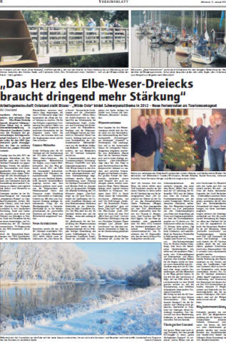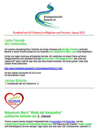 1. 1. 2012. Die gemeinnützige Arbeitsgemeinschaft Osteland e. V. hat zum Jahreswechsel Bilanz gezogen. Den Rückblick der "Lobby für die Oste" auf ihre Arbeit im Jahr 2011 veröffentlicht das Bremervörder "Sonntagsjournal" auf einer Sonderseite seiner aktuellen Ausgabe.