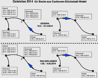 Neu ist in der jüngsten Auflage des Revierführers eine Beilage mit den optimalen Reisezeiten für Skipper aus Richtung Cuxhaven bzw. Hamburg-Wedel. Dieser "Ostelotse" - speziell geeignet für Törns zu Ostern, am 1. Mai, zu Himmelfahrt und zu Pfingsten - ist unter Berücksichtigung der Tidenzeiten für Elbe und Oste von dem Oberndorfer Segler-Ehepaar Bert und Marlene Frisch entwickelt worden.