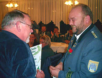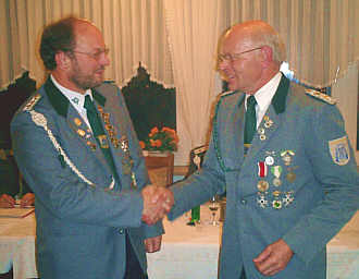 19. 11. 2005. Stehend applaudierten über 60 Schützinnen und Schützen am Freitag im Ostener Fährkrug ihrem Präsidenten Herbert Guthahn, der sich nach über 20 Amtsjahren aus der Vorstandsarbeit zurückzieht und zum Ehrenpräsidentenernannt wurde. Zum Nachfolger wurde einstimmig der bisherige Hauptmann Wilfried Röndigs gewählt, Röndigs' Amt übernahmThorben Gruschka.